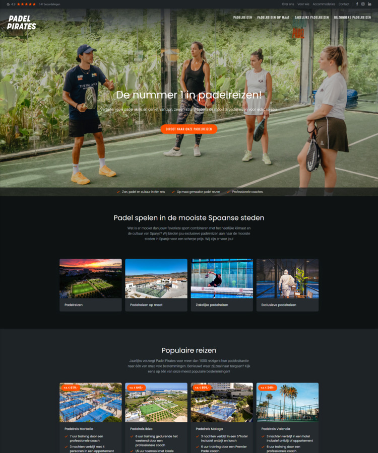 Padel Pirates startte met een instapwebsite bij Webstart, met als doel snel online zichtbaar te zijn en boekingen voor hun padelreizen naar Spanje te genereren. Dankzij sterke content en het slimme systeem behaalde de site binnen korte tijd meerdere top 3-posities in Google. Door de snelle groei werd het tijd om op te schalen...