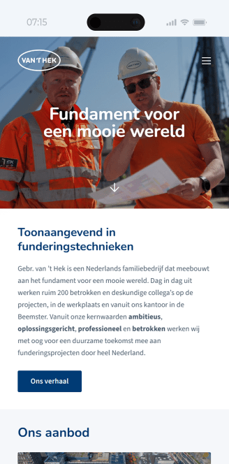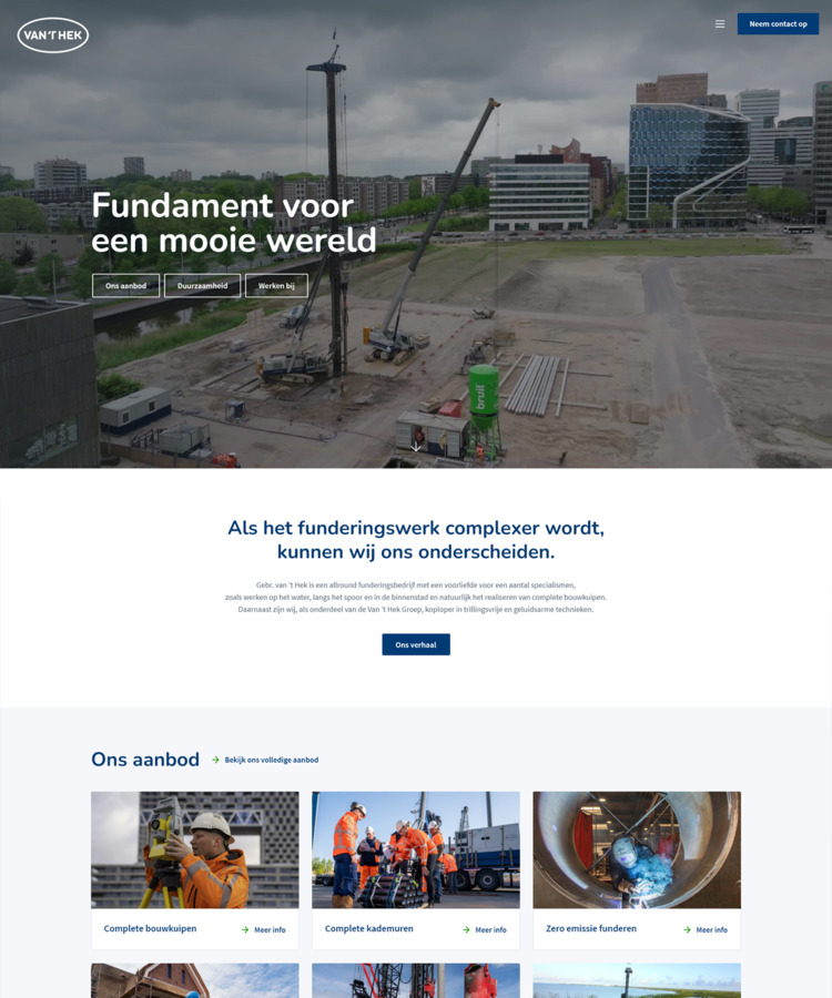 De Van 't Hek Groep wil een ontwerp realiseren dat als basis dient voor de ondernemingen van de Van 't Hek Groep. Te starten met Gebr. Van 't Hek. Een corporate uitstraling, duidelijke presentatie van het aanbod met aandacht voor actualiteiten en duurzaamheid. De basis is gelegd op Vanthek.nl. Personeel werven gebeurt via een eigen werkenbij-website.